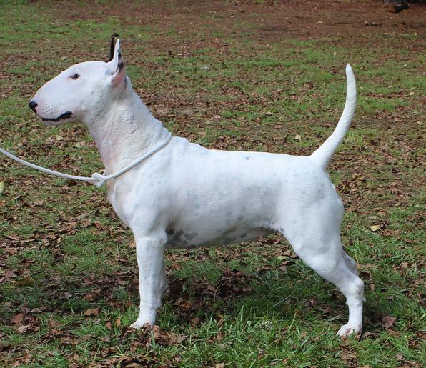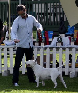 'Vision' is a Miniature Bull Terrier. She had a few owners before she landed with her best mate Arron - the two of them have been a team ever since. Arron and Vision have learned about dog shows and now look like seasoned professionals! PLL clear by DNA